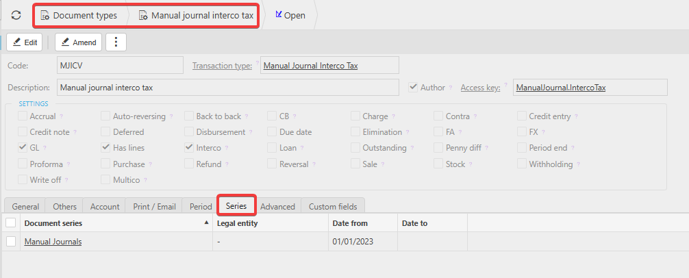 While you are in the Manual journal interco tax document type, go to the Series tab and make sure a Document Series is assigned.