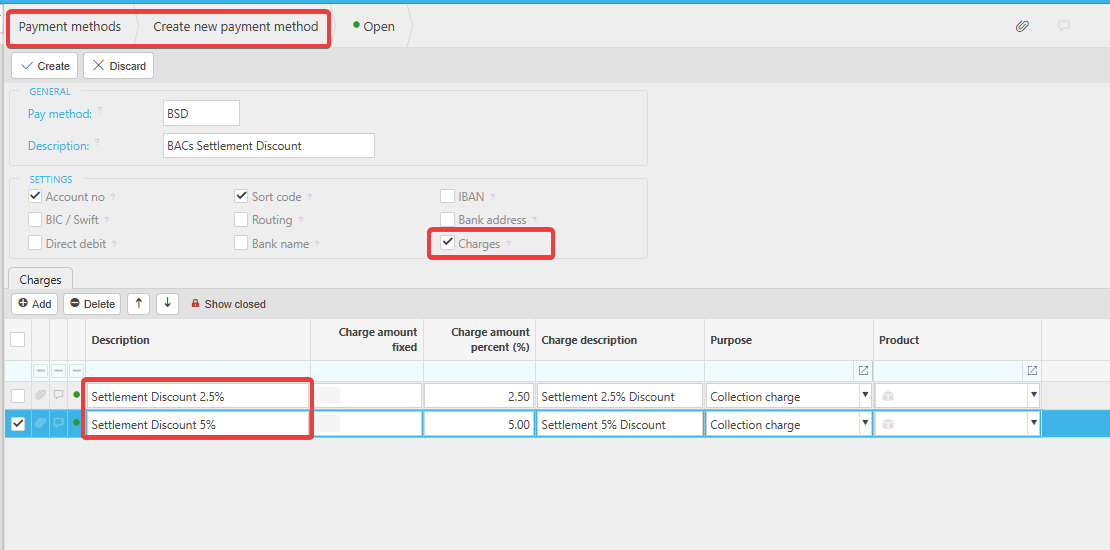 - Add all required settlement discount percentages (e.g., 2%, 5%, etc.).