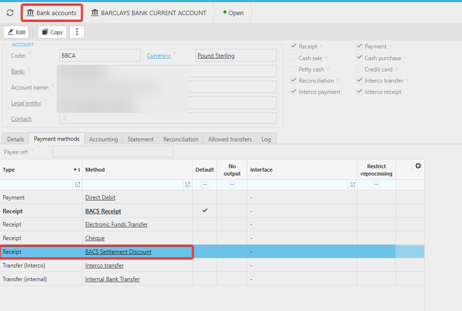 This ensures the discount options appear when receipts are created against this bank.