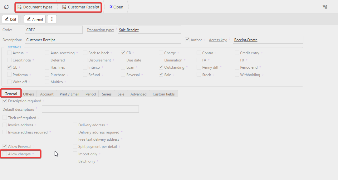 - Tick the Allow Charges setting on the others tab