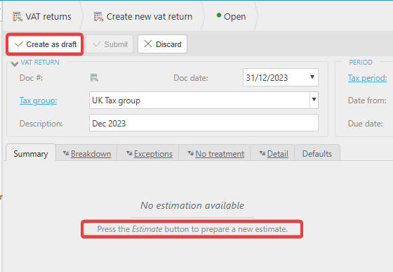 When creating a VAT return, it must first be created in Draft status.