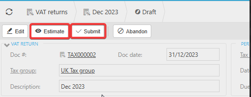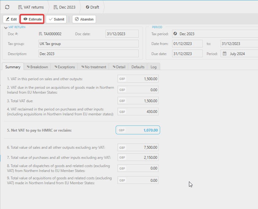 Once you are satisfied that the VAT return is correct, run a final Estimate to ensure the figures on the Summary page are fully up to date. After this, select Submit.