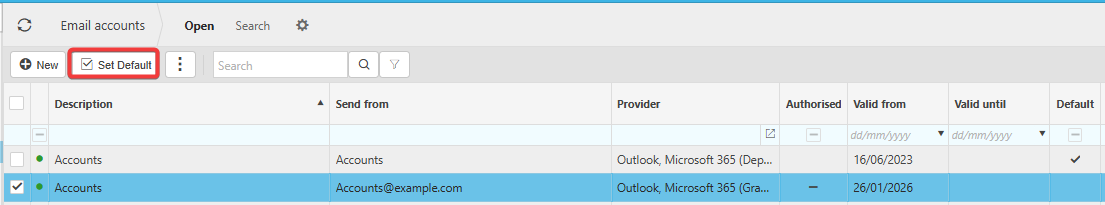 Please note you will need to update your default if you have added a new email account, this can be done from the main email account screen by highlighting the account you wish to be your default and selecting Set Default.