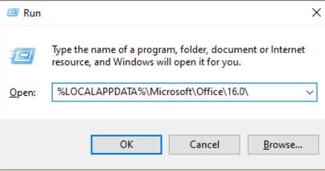 Then press windows + R and type %LOCALAPPDATA%\Microsoft\Office\16.0\ then press enter. (as per the below screenshot)