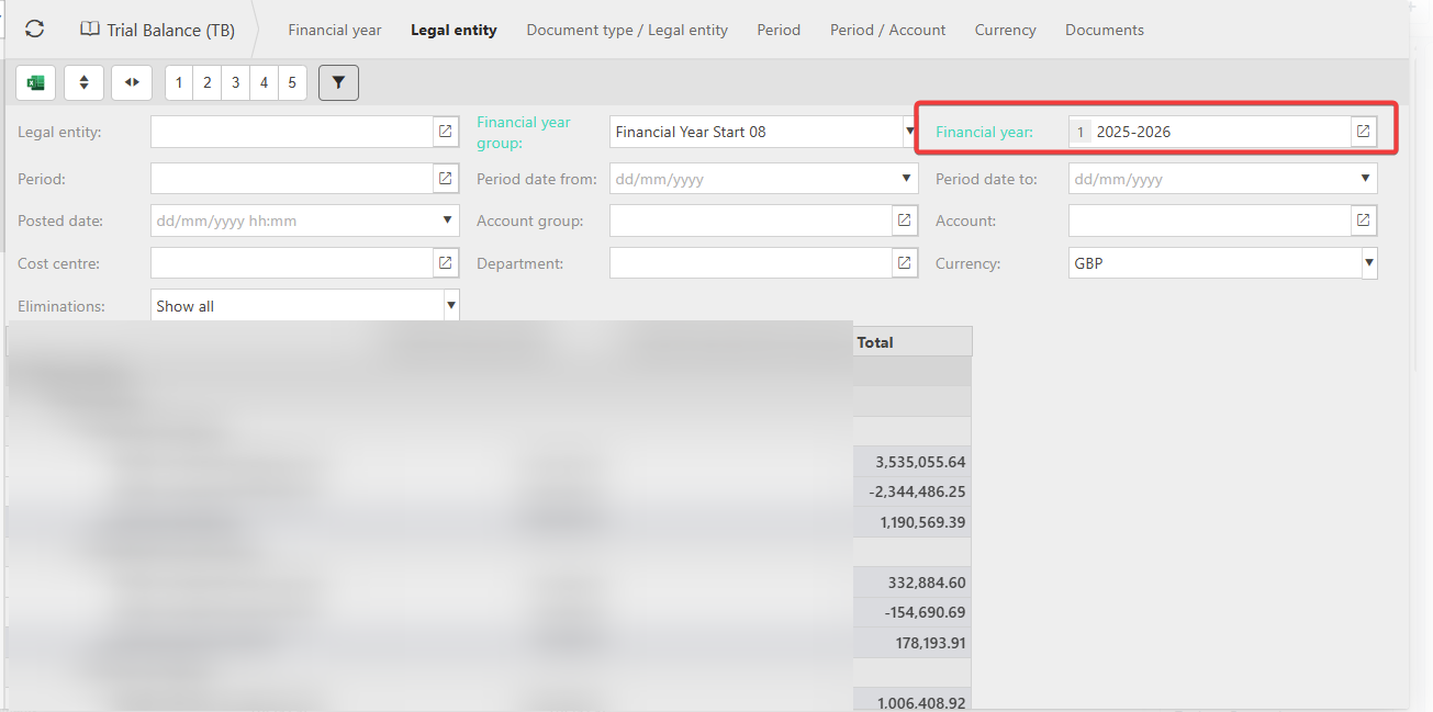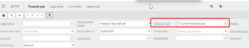 If the P/L Balance Sheet, etc. is not pulling through data for the Current F/Y, this may need updating against the Financial Year Group.