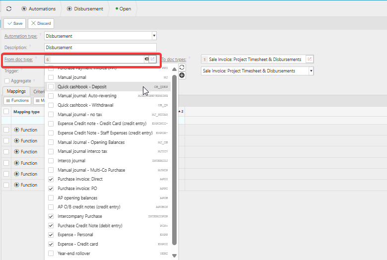 2. The automation setup for disbursements may not include the correct document types. To check this, navigate to the automation settings and confirm that the relevant document types are selected. If a document type hasn’t been included, it won’t appear in the disbursement selection.