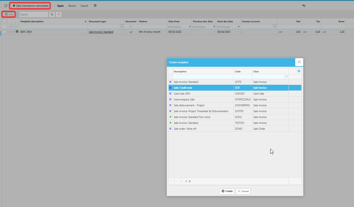 Once that’s done, you’ll be able to create and save templates from the Sales transaction template or Document templates screens by clicking new and selecting the document type.