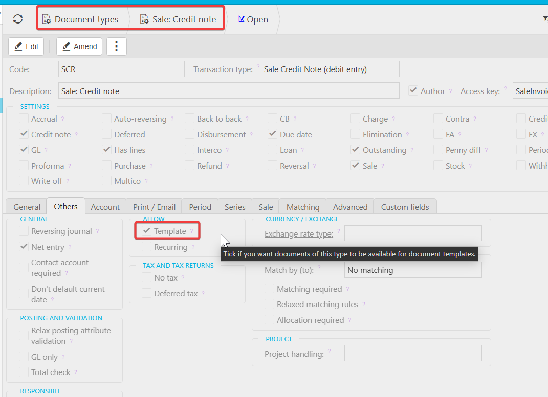 To create a template for the 'Sale: Credit Note' document type, you’ll first need to enable templates in the document types settings. Under the 'Others' tab (as shown below), please check the 'Allow Template' option, then reload iplicit.