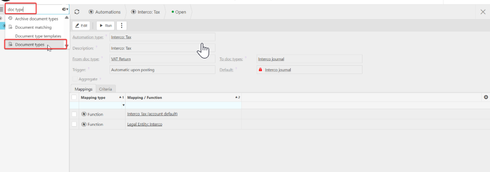 - Search for Interco Tax and open the document type