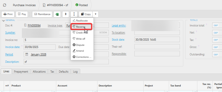 - Reversing the purchase invoice will also reverse all associated prepayment journals.