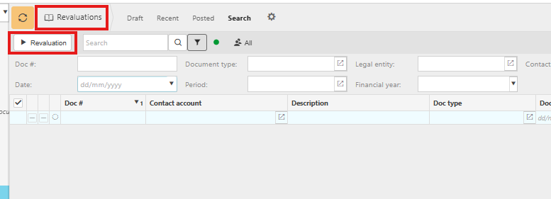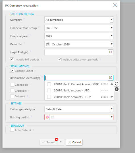 - Fill in the relevant information and under the revaluation(s) section click the option for Balance sheet and select the relevant bank account(s)