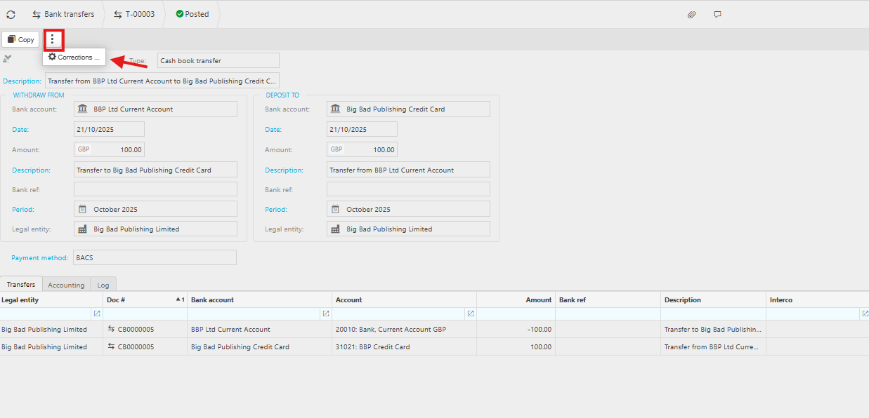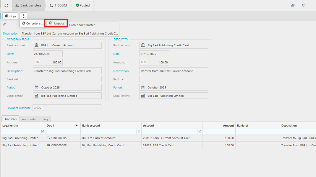 There is an option to do a correction on a bank transfer that is posted. Providing you have the relevant user permissions. This can only be done if the transactions within the transfer have not been matched in a submitted bank reconciliation.