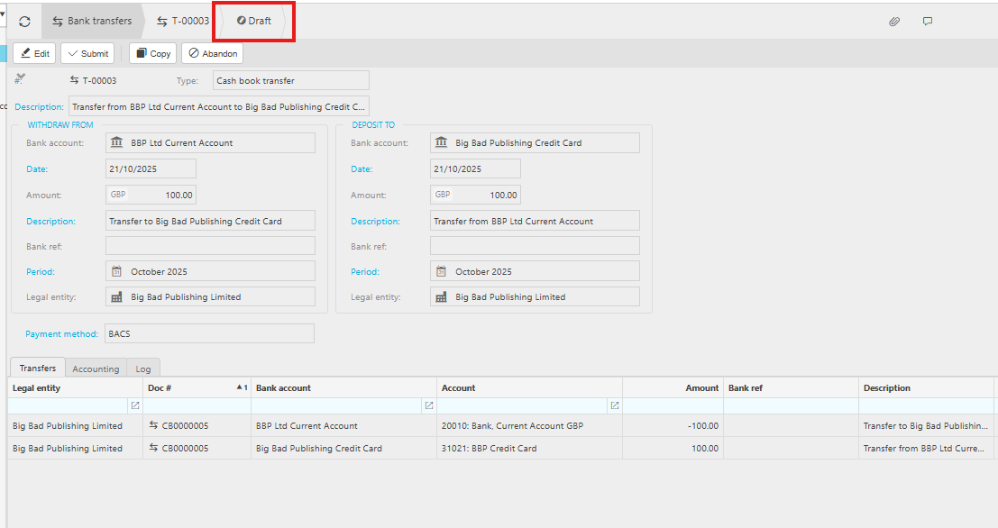 - Now the bank transfer is back in a draft status, and you can either Edit or Abandoned the document accordingly.