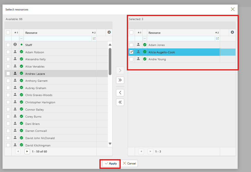- Now select the relevant users and double click to put them in the right-hand column. And click Apply button.