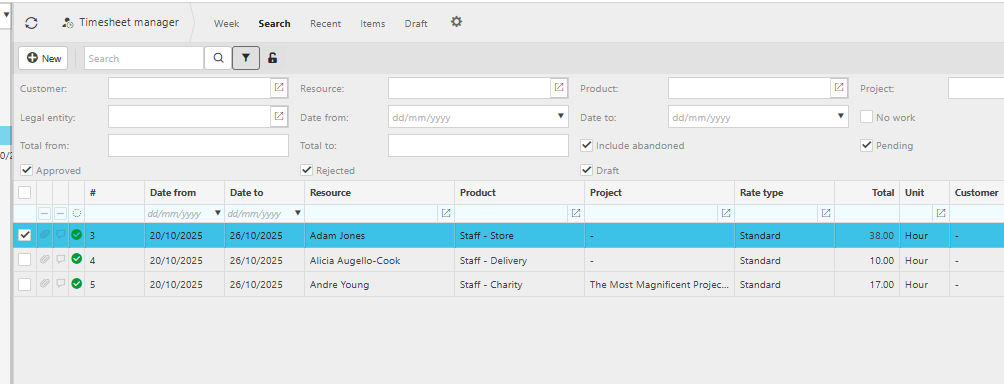 - Now you should be able to see their timesheets in the Timesheet manager finder screen.