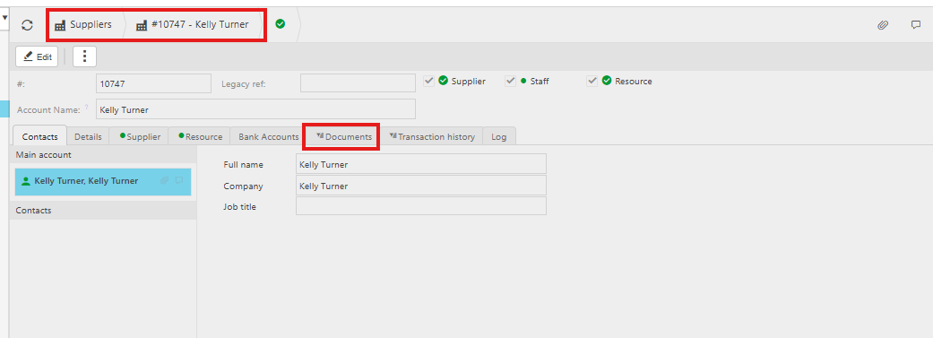 - Access the relevant Customer or Supplier account and click on the Document tab.