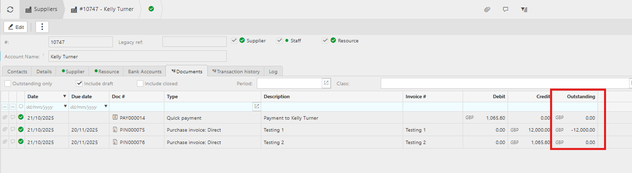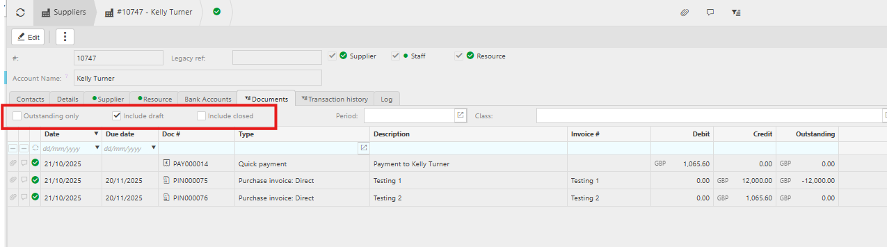 - In the document tab, you have the ability to view all documents, whether they are matched (allocated) or not. The options available are Outstanding only, Include Draft, or Include Closed.
