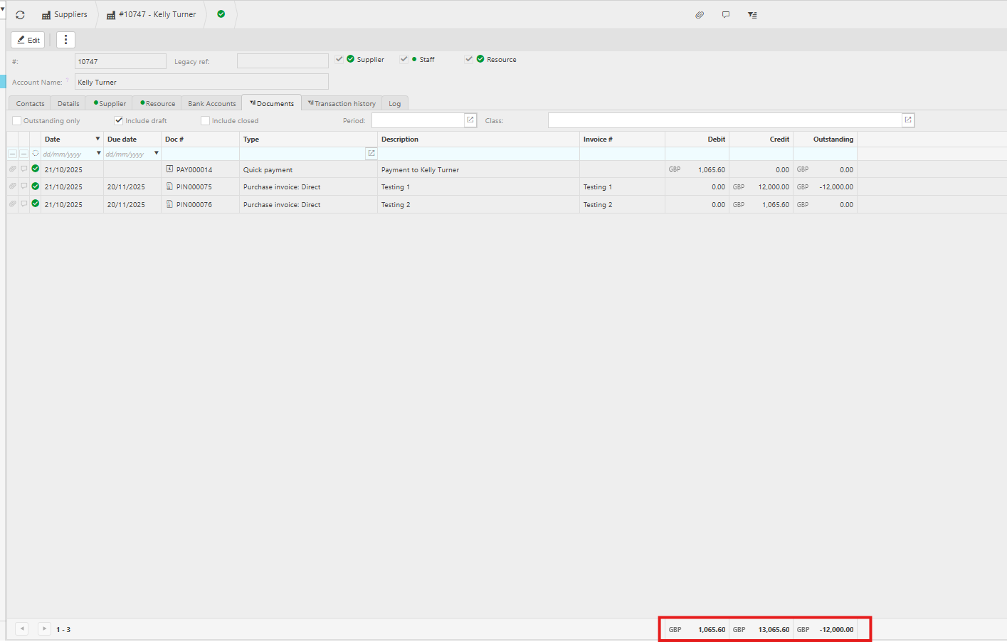 - At the bottom of the tab, it displays the Debit & Credit balances, along with the Outstanding Totals.