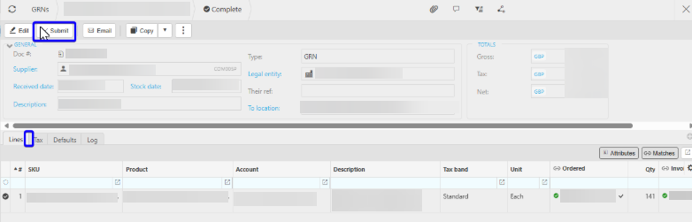 Once the GRN is submitted, the stock tab will appear, the stock will update to the actual balance, and the document will display the “Completed” watermark.