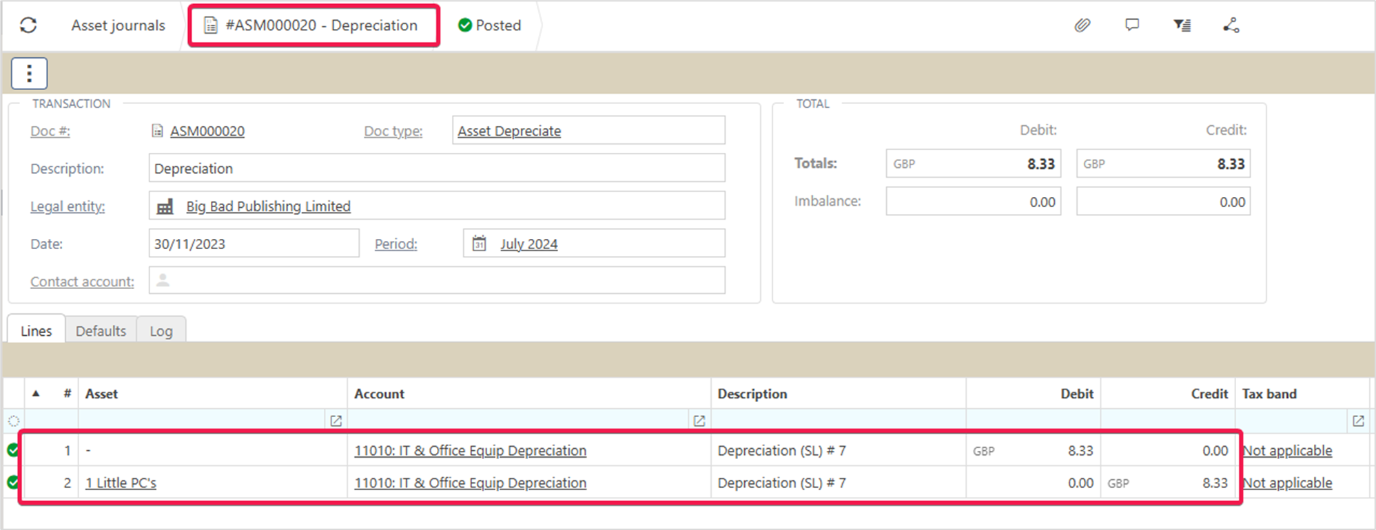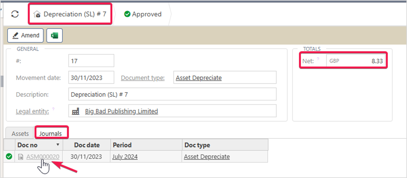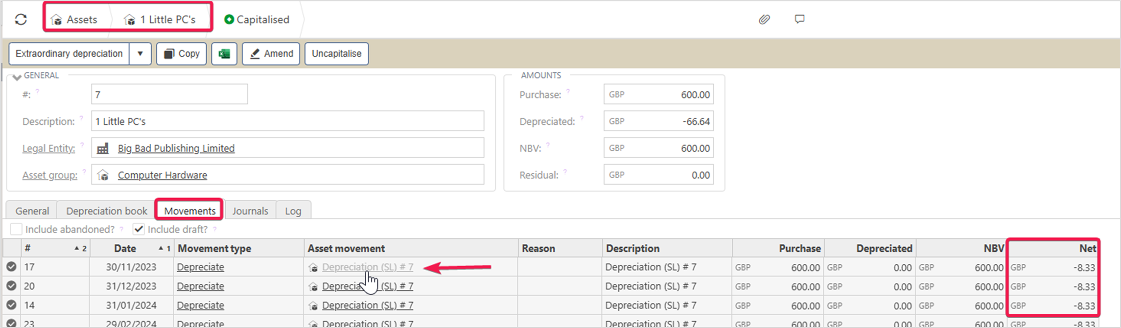 For example, in the case of a Depreciation movement, the Net column reflects the value of the depreciation journal.