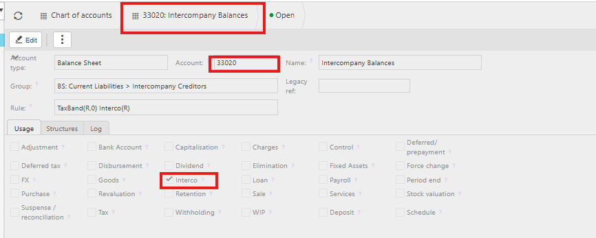 - Make sure that have a chart of account code that is used for the intercompany movements, and it has a tick on for Interco.