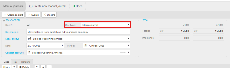 - On creating your manual journal, you would use the document type of Interco Journal.