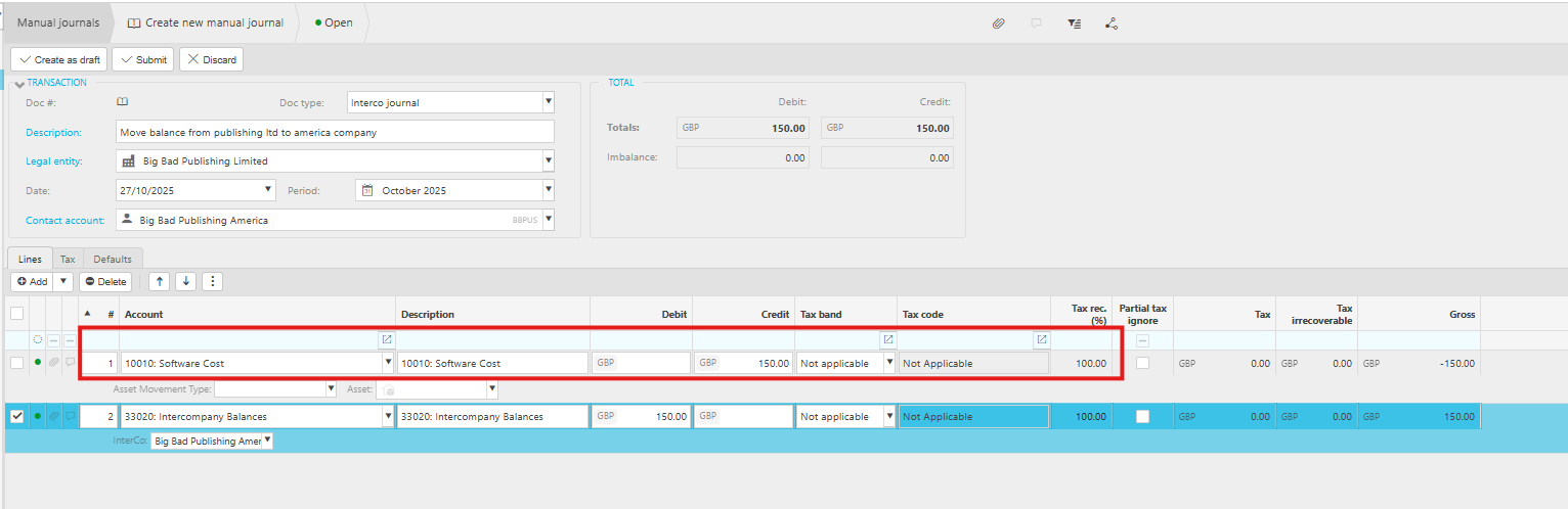 - On submitting that journal, iplicit will generate you another manual journal. Debiting the legal entity in my example to g/l code 10010. The values also show differently due to the base currency of the legal entity.
