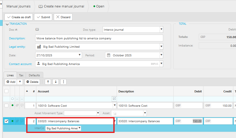 - Now the second line needs to go to that intercompany account, and the Interco attribute needs to be populated with the legal entity that the money is going to.