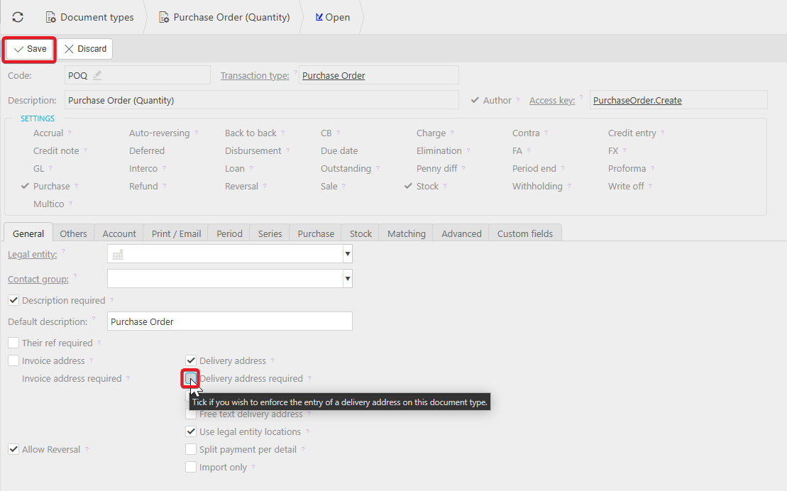 1. Navigate to Document types, search and drill into the relevant document eg. Purchase Order (Quantity). In the General tab, the Delivery address required is marked which would require the delivery address on Purchase orders. Edit.