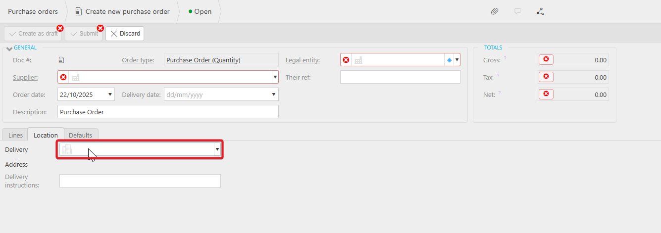 Now, when creating a Purchase order, the Delivery address is no longer a required field.