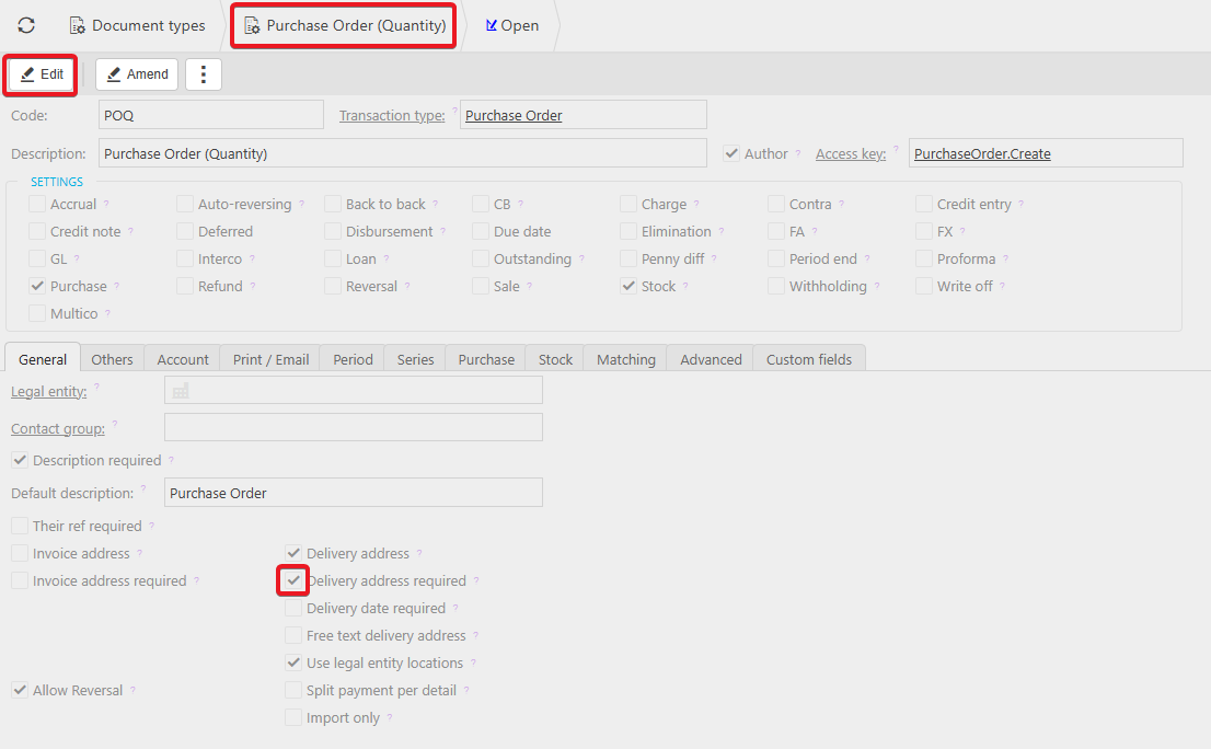 - Search for and open the relevant document type - for example, 'Purchase Order (Quantity)'