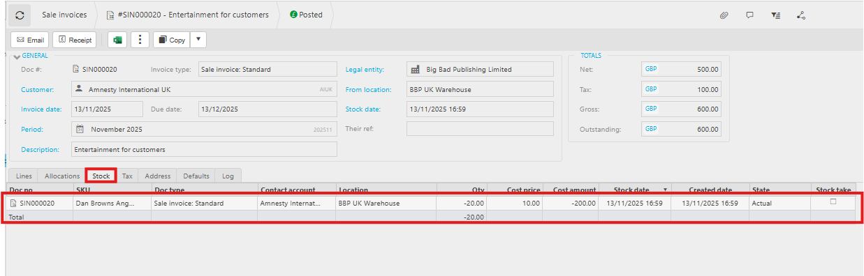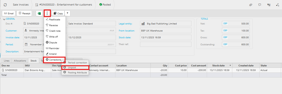 - Verify that the sale or purchase document has a stock tab. If it is absent, a potential cause may be a network interruption. We recommend unposting the document using the ellipse button.