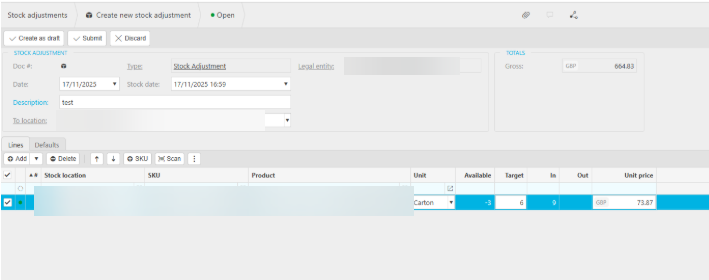 For example, if the product was at –3, entering a stock adjustment of +6 would bring the balance to +3.
