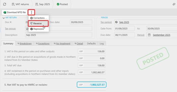 To reverse the return navigate to the return and click the ellipsis and select ‘reverse’: