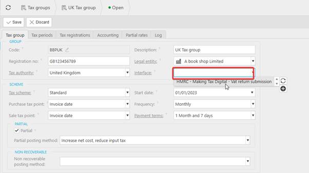 A similar approach will need to be taken if you are setting up MTD for the first time in iplicit and you have already posted documents with tax bands/codes in iplicit. Removing/not adding the interface, creating and posting tax returns, the add the interface to commence with posting VAT returns to HMRC following successful authorisation of MTD on the MTD registrations screen