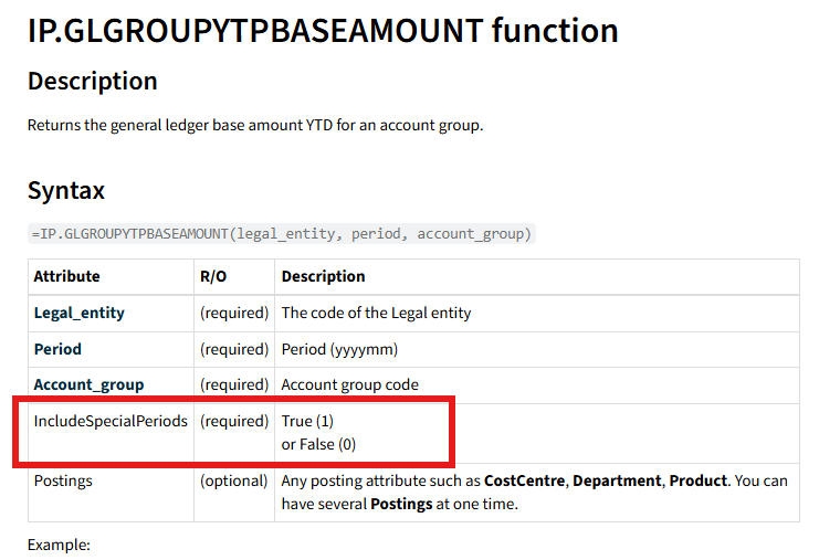 - For instance, IP.GLGROUPYTPBASEAMOUNT has the option to include b/f and special periods.