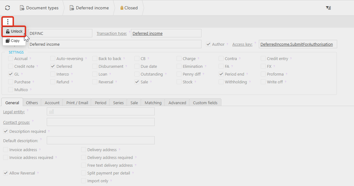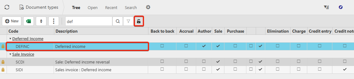 2. The deferred income document type will likely need to be unlocked. Navigate to Document Types, search and drill into Deferred income. Ensure the lock icon shows if this document type is locked.