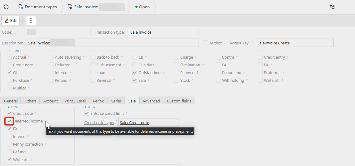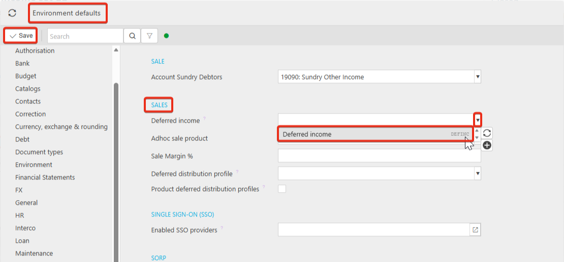 3. Navigate to Environment defaults > Sales and select the Deferred income document from the dropdown. Save.