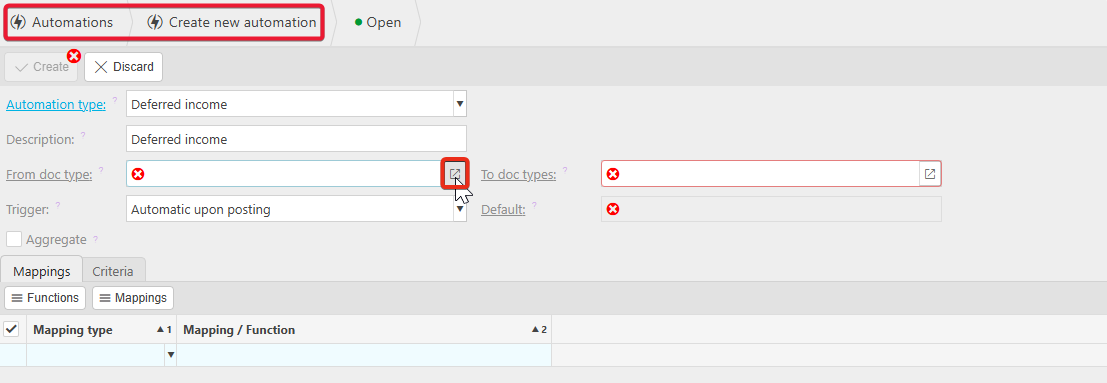 4. Now when creating the Deferred income automation and entering the Description, the necessary fields would be populated. Drill into the selector on the From doc type.
