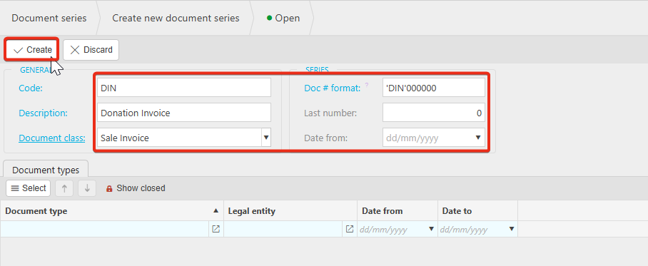 2. Enter the fields as shown below. For the example, the series is named Donation Invoice, however you will name this whatever you would like to help differentiate the documents. Create.