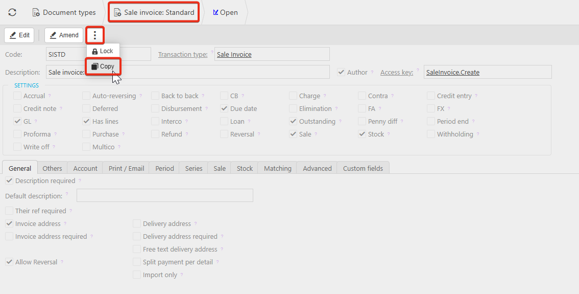 3. Next, navigate to Document types and locate and drill into Sale invoice: Standard. Select the ellipsis>Copy.