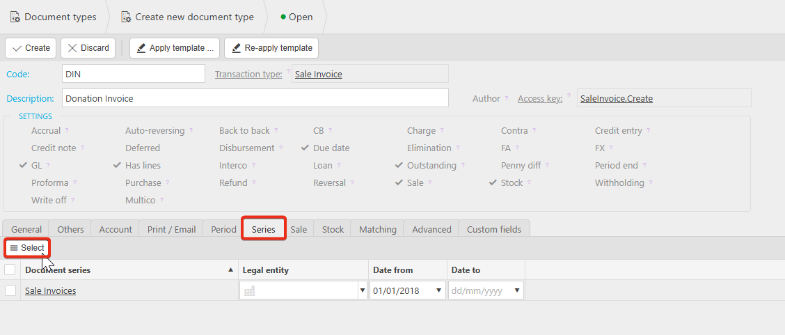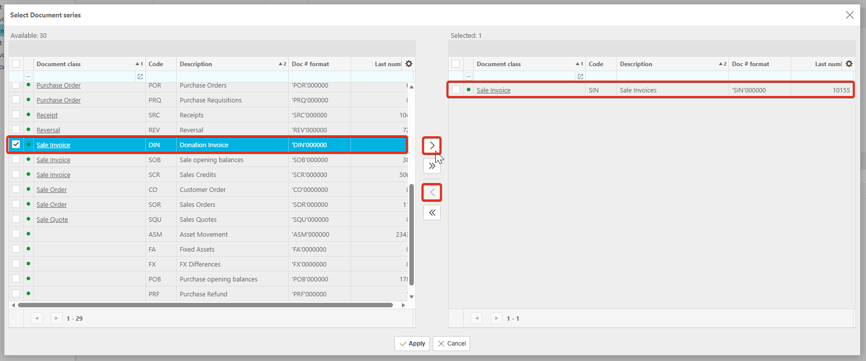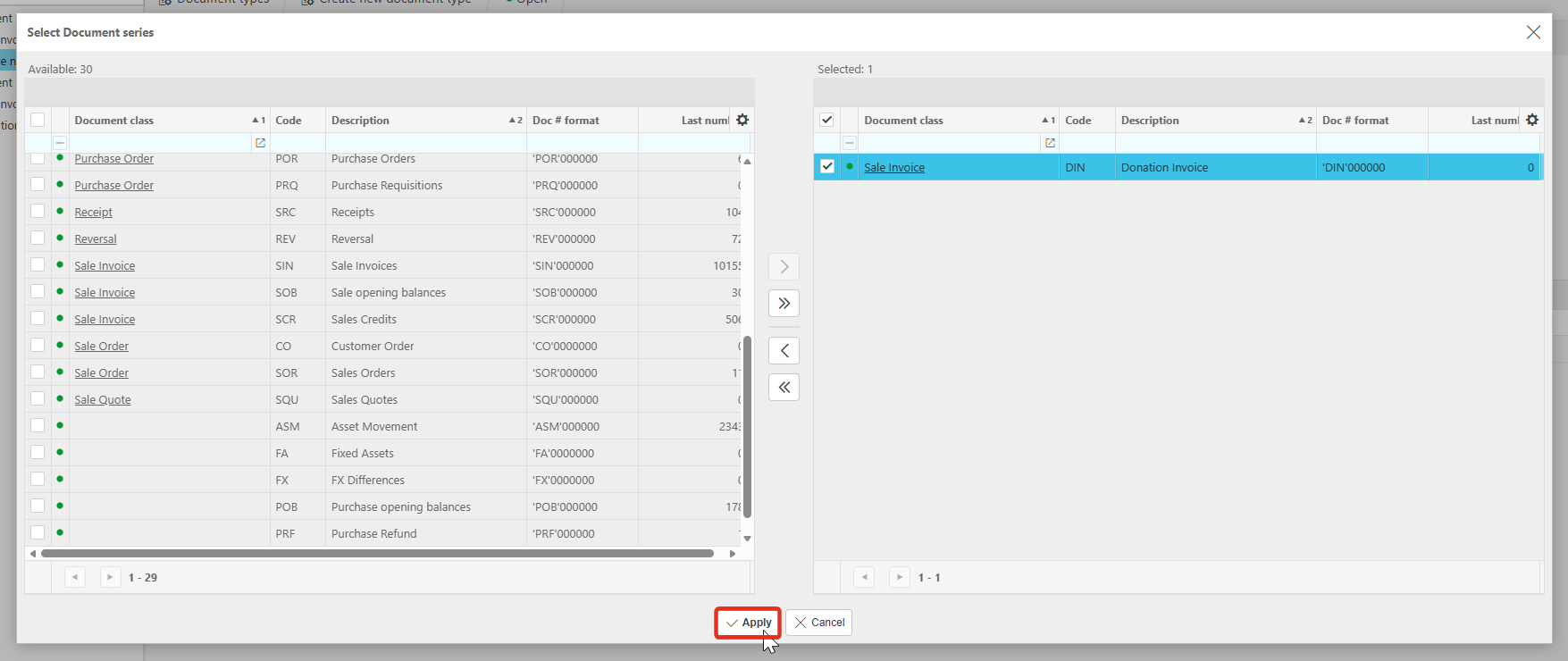 6. Locate the Donation Invoice document series on the left and move it to the right. Move the Sale invoice from the right to the left.