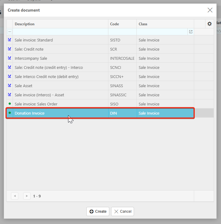 9. Now, when creating a new invoice, the Donation invoice is available.