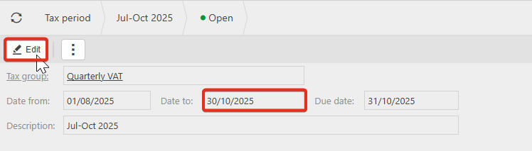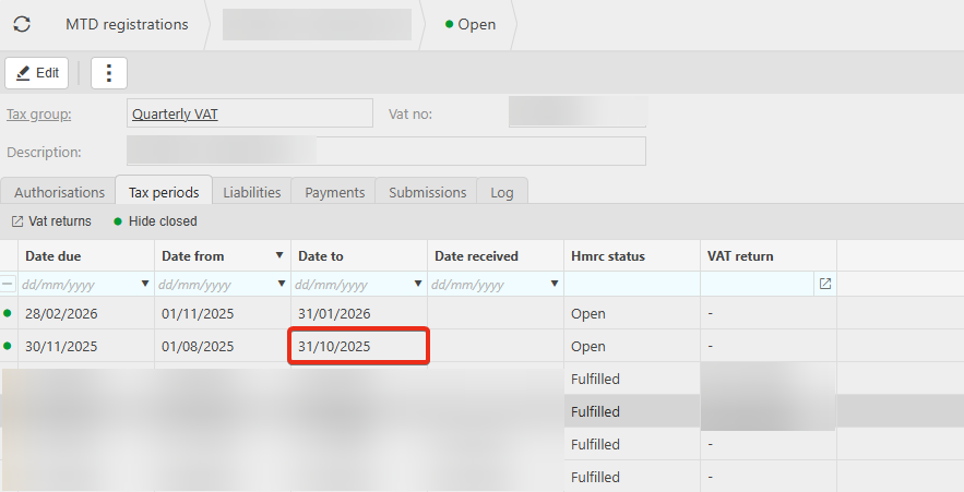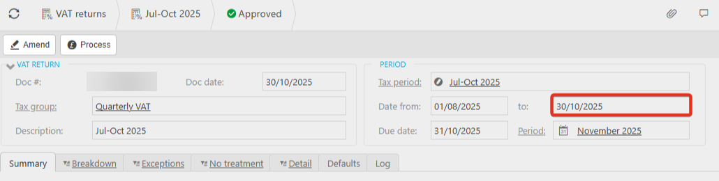 Looking at the below VAT return example, the To date is set to 30/10/2025