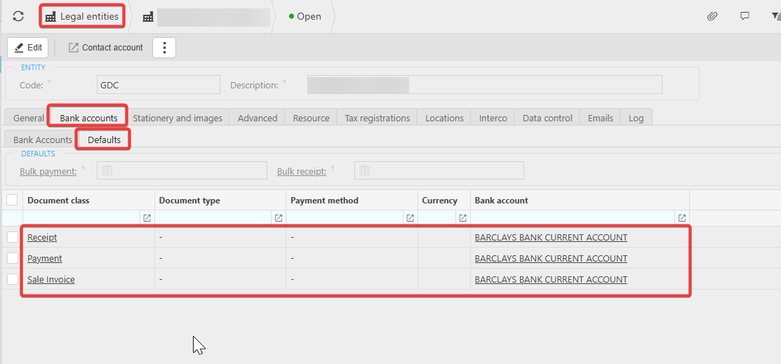 This setting can be added from the Legal Entity main screen for the relevant entity. Go to the Bank Accounts tab and then open Defaults.