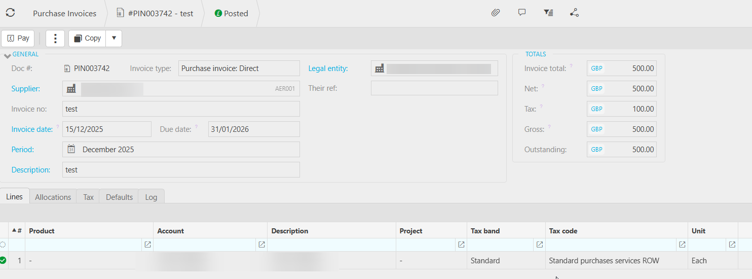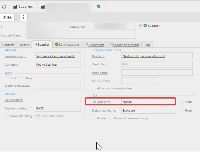 If the supplier is set up with a different tax authority than the legal entity, iplicit will automatically apply the Reverse Charge on service transactions when you use the standard or reduced rate tax bands. No additional setup is required.