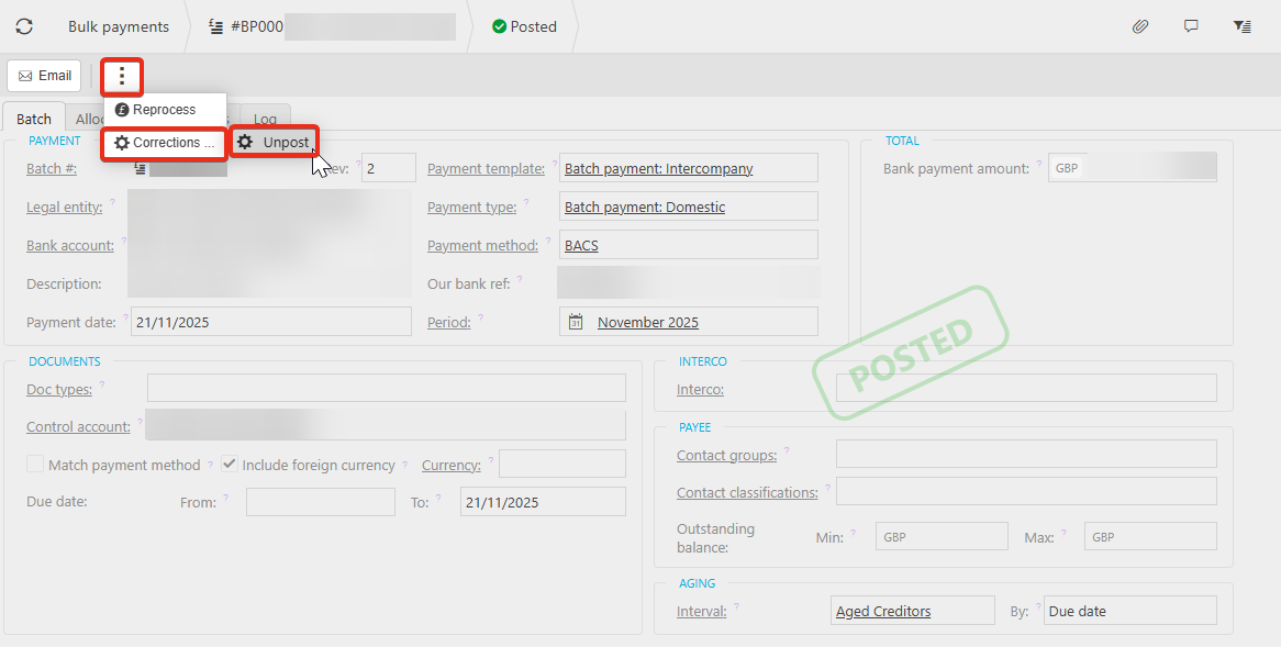 1. Go to the payment. Click on the three dots > Corrections > Unpost.