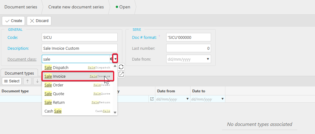 2. Enter the fields as shown below. For the example, the series is named Sale Invoice Custom, however you will name this whatever you would like to help differentiate the documents. Select the relevant document class from the dropdown. The prefix on the Doc # format can be whatever you would like it to be depending on your requirements.