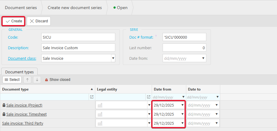 5. Ensure the Date from is dated before any document dates you will be creating. Click create to finalise.