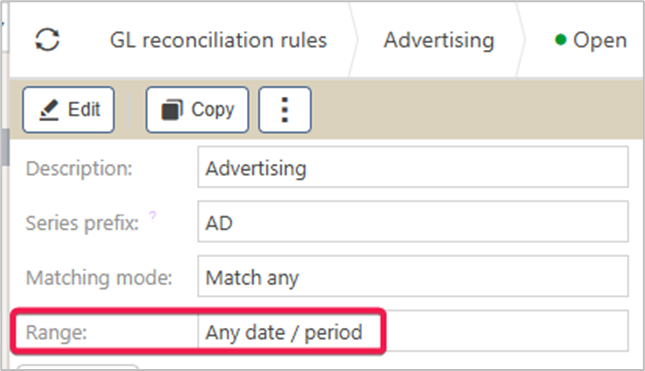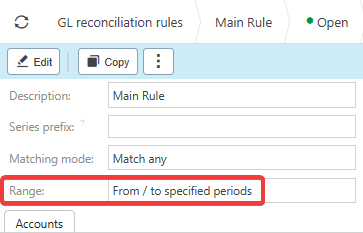 In the GL Reconciliation rule example below, the range does not require a specified period or date, therefore these options are greyed out on the GL Reconciliation: